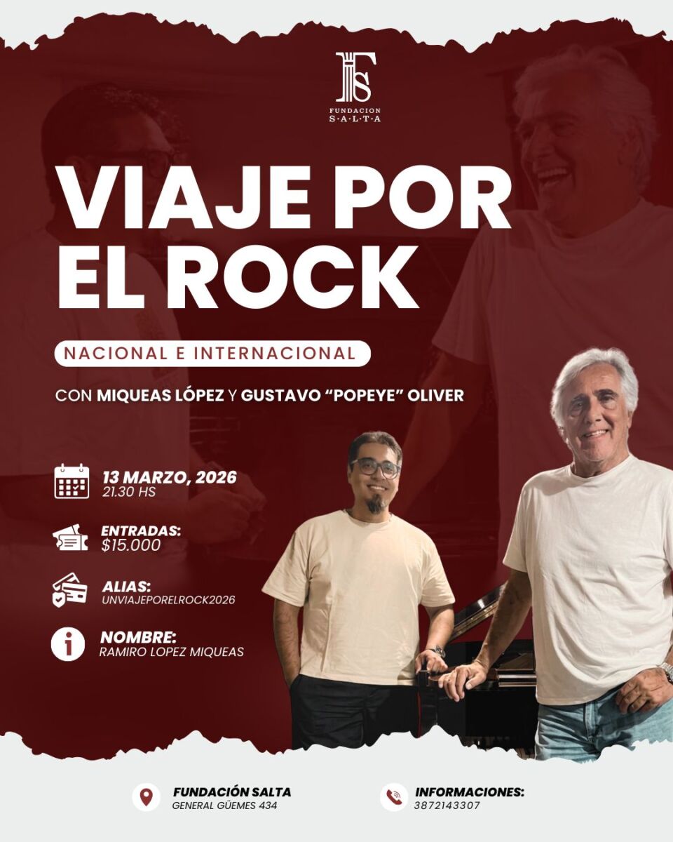 El evento se realizará el viernes 13 de marzo a las 21.30 horas en la Fundación Salta, General Güemes 434. La velada contará con la participación de los músicos Miqueas López y Gustavo “Popeye” Oliver, quienes ofrecerán un recorrido musical por distintas etapas del rock, combinando interpretación en vivo con relatos y referencias a las obras y artistas que marcaron época.